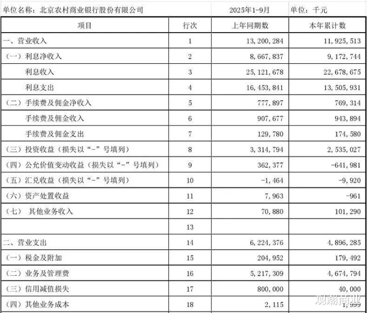 不过,关文杰离任前的北京农商银行,正面临着复杂的经营环境。2025年第三季度报告显示,该行前三季度营收为119.26亿元,同比下降9.66%。